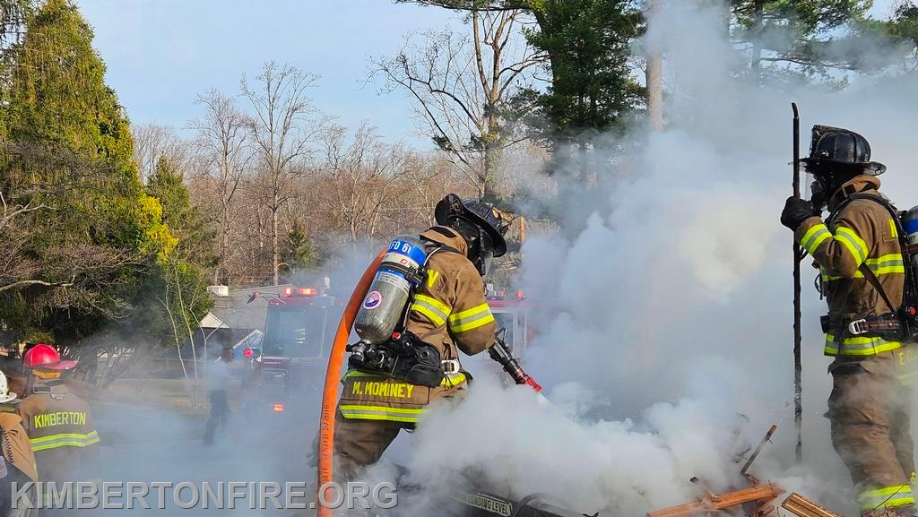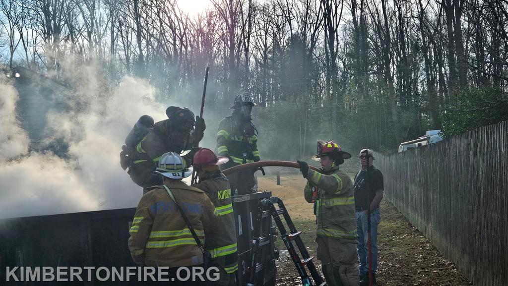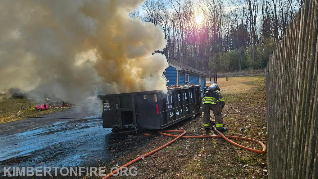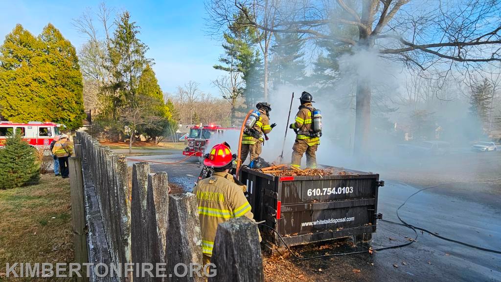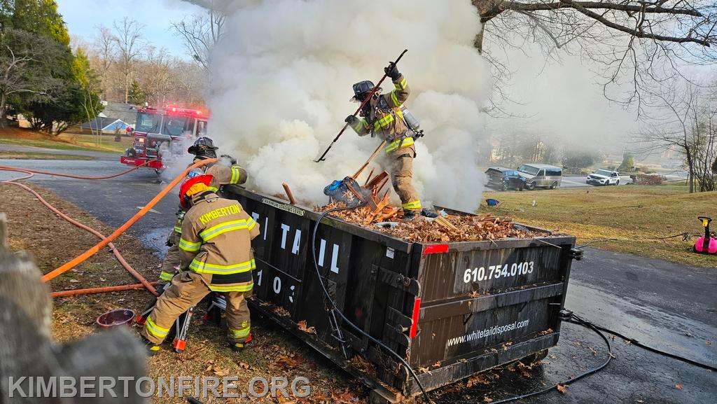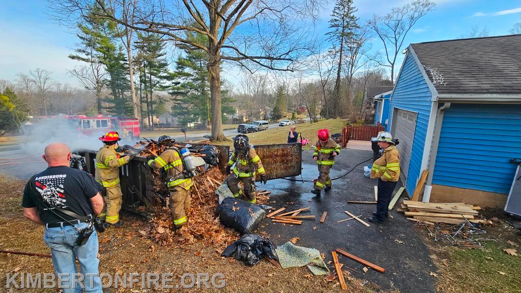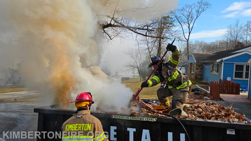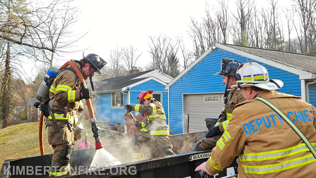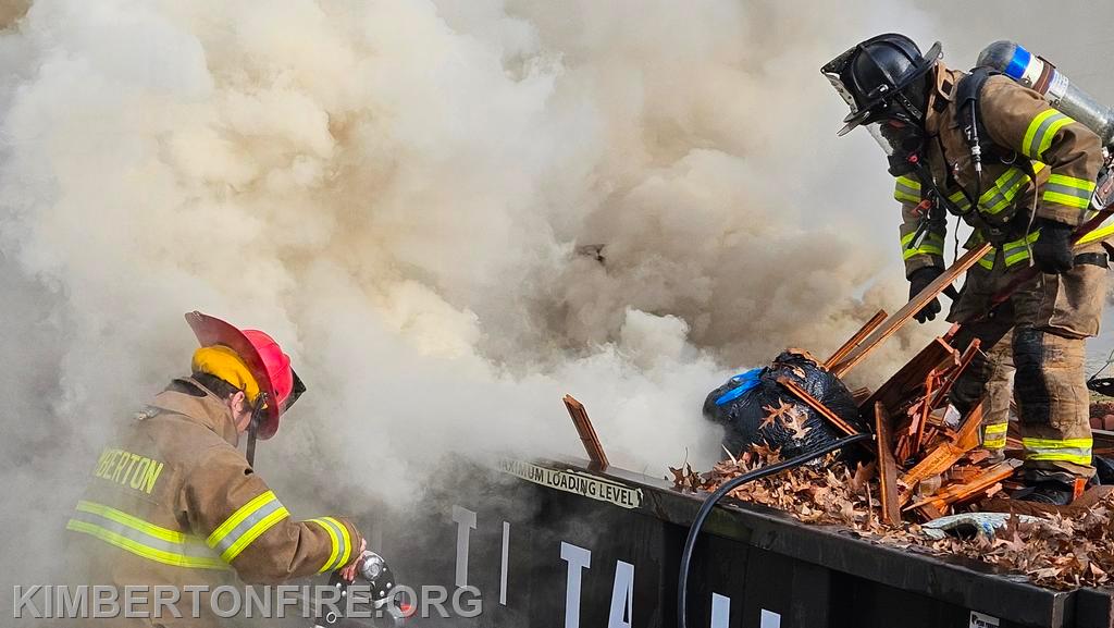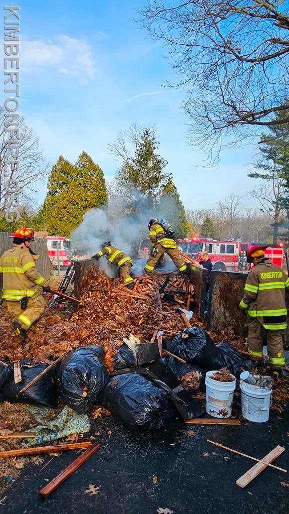 Wednesday March 11, 2026. West End Ambulance (MICU 67) called in this dumpster fire while responding to a call down the street just after 8:30 this morning. The call was in the 200 block of Kimbel Drive. Firefighters were met with a large dumpster with heavy smoke coming from it and a neighborhood blanketed in smoke. The dumpster was loaded with old hardwood flooring, contractor materials, leaves and trash. Crews used around 2000 gallons of water to extinguish the fire, and were on the scene about an hour.